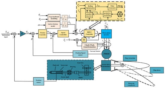 Figure 1 presents a schematic diagram of the electromechanical actuator, which consists of a flight control computer, an actuator control unit, a power supply, a permanent magnet synchronous motor (PMSM), a reducer, and a roller screw. The system operates as follows: the flight control computer sends a position command, which is then processed by the actuator control unit. This unit collects position feedback from the PMSM and the linear displacement data from the linear variable differential transformer (LVDT). It performs highly dynamic closed-loop control of position and speed by coordinating the motor-driven gearbox, roller screw, and other components, thereby enabling the flaps to execute the lowering and retracting actions [27].