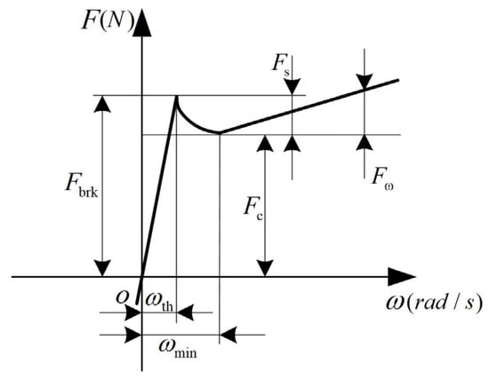 In Figure 5, ωth is the velocity threshold in the linear region; ωmin is the minimum velocity required to transform static friction into viscous friction; Fbrk is static friction; Fω is viscous friction; Fc is the Coulomb friction; and Fs is the maximum static friction.