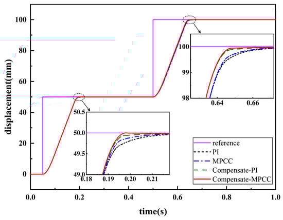 Figure 7 shows the output displacement tracking curve of the flap EMA before and after compensation using the two control methods. In the simulation, the system was given an initial reference displacement of 50 mm at 0.05 s, corresponding to the scenario in Figure 1 where the flap is not fully lowered. The second reference displacement of 100 mm was given at 0.5 s, corresponding to the scenario in Figure 1 where the flap is fully lowered. As shown in Figure 7, both control methods, before and after compensation, were able to track the given position. A local zoom in Figure 7 shows the tracking performance near the reference position at 0.2 s, while another zoom focuses on performance near the position at 0.65 s. The figure indicates that the Compensate–MPCC control method tracks faster compared to the other methods. Table 4 presents a comparison of the output displacement results under different control methods. The localized zoomed-in graphs in Figure 7 indicate that the four control methods approach the first and second reference displacements at approximately 0.2 s and 0.66 s, respectively. Therefore, Table 4 was used to compare the flap EMA output displacement data at 0.2 s and 0.66 s in the simulation. Table 4 shows that the output displacement of the Compensate–MPCC control method is closer to the system’s reference displacement compared to the other control methods.