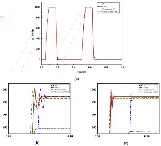 Figure 9 illustrates the PMSM speed curve, while Table 6 compares the speed results across different control methods. By combining Figure 7 and Figure 9, it can be observed that during the two position tracking processes, both control methods, before and after compensation, quickly reached the vicinity of the rated speed, demonstrating a fast dynamic response. The two enlarged views, along with Table 6, show that the MPCC, Compensate–PI, and Compensate–MPCC methods exhibit relatively small speed tracking errors compared to the traditional PI control method, with the Compensate–MPCC method achieving the smallest speed tracking error. However, the traditional PI control method provides smoother speed operation when approaching the rated speed compared to the other control methods.