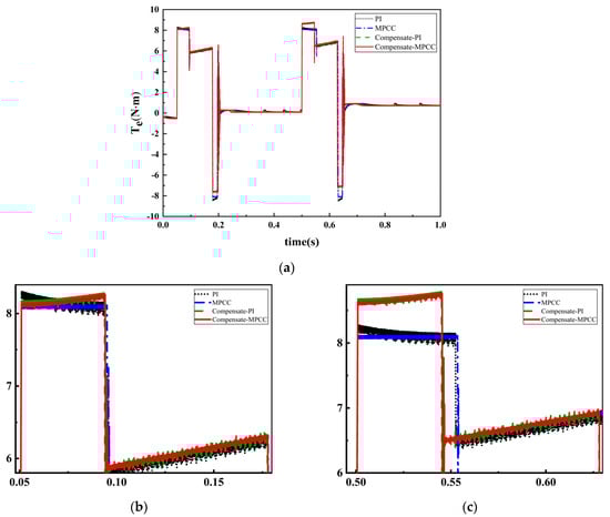 Figure 10 shows the electromagnetic torque curve. It can be observed that torque pulsation is larger with the traditional PI control method and smaller with the Compensate-MPCC control method after gear backlash torque and friction torque current compensation. Based on the calculation and analysis of electromagnetic torque data, the Compensate-MPCC control method reduces torque ripple by 15.4% compared to the traditional PI control method.