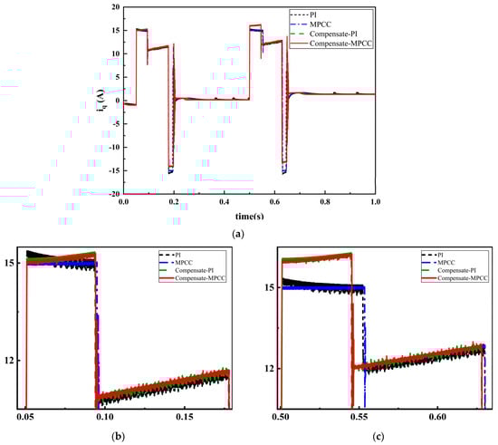 Q-axis current graphs. (a) General curve of q-axis current. (b) Partial enlargement 1. (c) Partial enlargement 2.