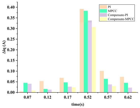 Figure 11 shows the q-axis current curve. By calculating the mean and standard deviation of the q-axis current data at different sampling times, the q-axis current fluctuations during system operation are shown in Figure 12. Table 7 presents the q-axis current fluctuations at 0.12 s, 0.52 s, and 0.62 s under different control methods and sampling times. From the simulation results and data comparison, it is evident that the two control methods with gear backlash compensation and friction compensation result in smaller q-axis current fluctuations compared to the uncompensated control method. As shown in Figure 12 and Table 7, the Compensate–MPCC control method exhibits the smallest current fluctuation among the four control methods and demonstrates superior static characteristics. In contrast, the traditional PI control method shows the largest q-axis current fluctuation.