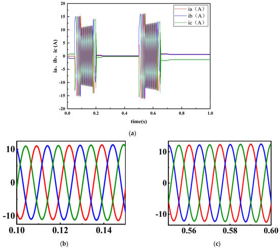 Three-phase stator current curves under Compensate–MPCC control method. (a) General curve of stator three-phase current under Compensate–MPCC control method. (b) Partial enlargement 1. (c) Partial enlargement 2.