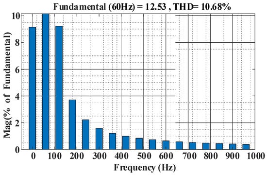 Figure 13 shows the three-phase stator current waveform under the Compensate–MPCC control method, and Figure 14 presents the harmonic analysis of the three-phase stator current. These figures show that the three-phase stator current waveform is slightly distorted during the system’s start–stop process. However, when the system operates stably, the current waveform exhibits better sinusoidal characteristics. At this time, the total harmonic distortion (THD) of the current is 10.68%, indicating relatively stable overall performance.