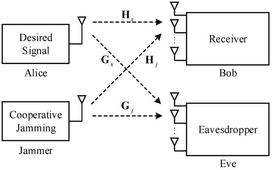 Consider the system model shown in Figure 1, which includes a desired signal transmitter (Alice), CJ transmitter (Jammer), licensed receiver (Bob), and eavesdropper (Eve). Alice and Jammer each have a single antenna, and Bob and Eve are equipped with N antennas. Assume that the channel matrices of Alice to Bob and Eve are and , and the channel matrices of Jammer to Bob and Eve are and , respectively.