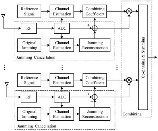 At Bob, the jamming is separated from the mixed signal, and the residual signal is then combined according to a certain weight (see Figure 2). In this paper, CJ cancellation and combining are carried out in Bob. The original jamming is used for CJ reconstruction by using the estimated channel coefficient, and the reconstructed CJ is subtracted from the received signal. After jamming cancellation, the combined coefficient is estimated, and the combined signal is obtained according to the weight of each branch phase.