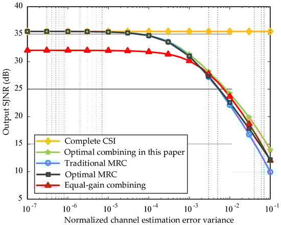 Firstly, Figure 3 shows the output SJNR under different normalized channel estimation errors, where the errors of each branch are uncorrelated. Let the normalized channel estimation error variance of the desired signal and CJ on each branch be equalized; this applies in the following simulations. When the channel estimation error is small, the output SJNR of the proposed optimal combining scheme and MRC schemes are both close to the ideal MRC. When the channel estimation error is large, the residual jamming is large; thus, the output SJNR of the three schemes deteriorates. Still, the performance of the optimal combining scheme is always better than that of MRC schemes, and the greater the channel estimation error, the more obvious the advantage of the optimal combining scheme over MRC schemes. Among them, the performance of the optimized MRC scheme is better than that of the traditional MRC scheme because the channel estimation error of the communication signal is considered. Moreover, compared with equal-gain combining, the optimal combining scheme can obtain a higher output SJNR, especially when the channel estimation error is small.