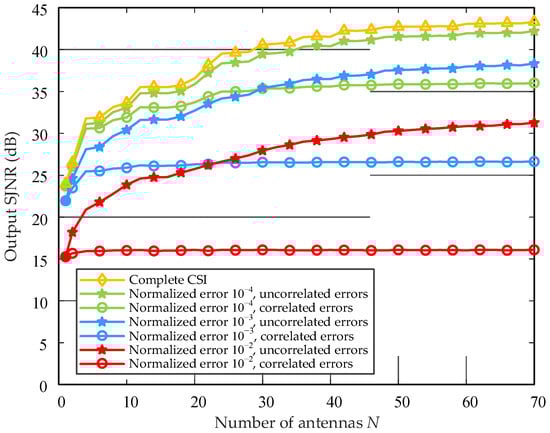 Next, Figure 4 compares the effect of antenna number on the output SJNR when the channel errors of each branch are correlated and not correlated. When the channel estimation errors between branches are not correlated, the growth trend in the SJNR in optimal combining is similar to that of ideal MRC, which increases with the increase in antenna number. In this case, the residual jamming can be regarded as noise, and its influence on performance can be reduced by increasing the number of antennas. On the contrary, when the channel estimation errors among branches are completely correlated, increasing the antenna numbers cannot reduce the influence of residual jamming on the output SJNR. In particular, the larger the normalized channel estimation error, the more limited the optimization of the SJNR by combining. These phenomena are consistent with remark 2 and remark 3.