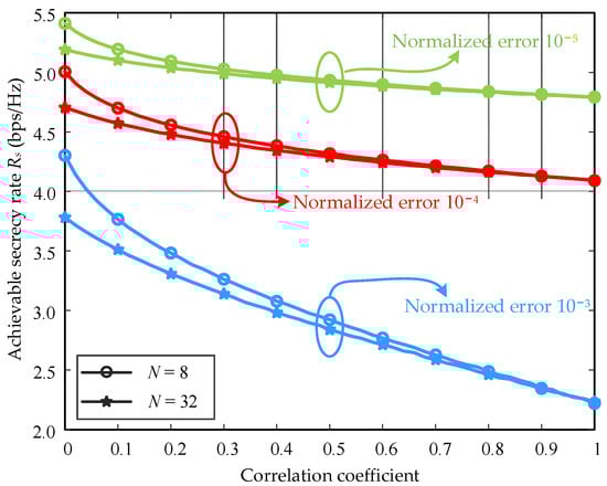 Suppose Bob and Eve are close to each other, and , [23]. Figure 5 further proves that the optimization effect of increasing the number of antennas decreases as the error correlation increases. Compared with the curve for the same number of antennas, the achievable secrecy rate decreases with the increase in the normalized channel estimation error, regardless of whether the channel estimation errors are correlated. It is worth noting that for the perfectly correlated channel estimation errors, when the normalized channel estimation errors are large, the achievable secrecy rate cannot be improved, even if the number of antennas is increased.