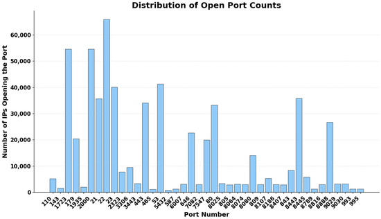 After encoding the dataset, we integrated features such as IP addresses, country regions, latitude and longitude, C-class and B-class segments of IP addresses, and port opening statuses to form a comprehensive network port opening dataset. Through preliminary statistical analysis, we particularly focused on the data distribution across different ports, as shown in Figure 1. The analysis revealed that the distribution of open ports was highly uneven, with most IP addresses having a very limited number of open ports, averaging only 0.5 open ports per IP. Specifically, on average, each port was shown to be open for 14,407 IP addresses, with port 22 having the highest number of open instances, likely due to the widespread use of SSH services. In contrast, port 5432 (typically used for PostgreSQL databases) had the fewest open instances, possibly because fewer nodes use this service or because the related services are often deployed on non-standard ports. These findings are consistent with observations in the existing literature regarding the usage of network services, further confirming the accuracy and reliability of our data analysis.