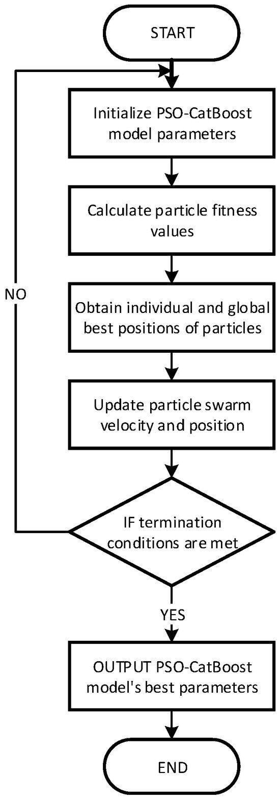 Equation (3) is used to update the velocity of a particle, helping it to maintain its current search direction, while steering towards both its own best position and the global best position. Equation (4) is used to update the particle’s position, with the position update based on the newly calculated velocity, which determines the direction and distance of the particle’s movement in the hyperparameter space. The PSO algorithm continuously updates the velocity and position of particles to search for the hyperparameter combination that maximizes the performance of the CatBoost model. Specifically, each particle represents a set of hyperparameters for the CatBoost model, and the particle’s fitness (performance) is assessed based on the model’s classification accuracy on the validation set. Through an iterative process, the PSO algorithm gradually guides the particles towards areas of hyperparameters that can improve the model’s accuracy, ultimately finding the optimal or near-optimal hyperparameter combination.