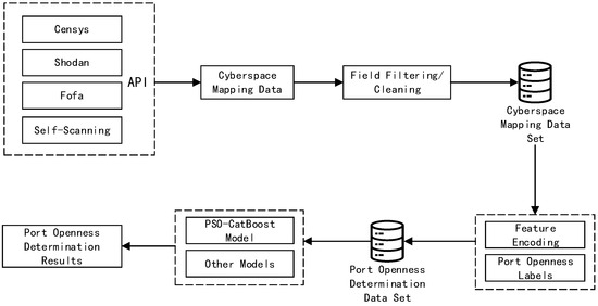 We leverage machine learning techniques to transform traditional port scanning tasks into classification tasks for predicting the open status of specific ports, determining whether they will respond to probing requests. In this task, the open status of ports is treated as a binary label that can be predicted using classification models. We focus on one ASN (AS4134) and collect port openness data by calling the APIs of Internet space search engines such as Fofa [14], as well as through self-conducted probing. After preprocessing, the data are labeled according to the actual open status of the ports. Port features are broadly categorized into two groups: intrinsic features of the asset (such as certificates and services) and peripheral features related to the IP port (such as subnet information and geographical location). To ensure that the model has greater practical application value, we primarily use peripheral features related to the IP port as the basis for prediction. Given that CatBoost (categorical boosting) performs exceptionally well in handling classification problems, especially in heterogeneous datasets, we chose CatBoost as the base model. CatBoost is a machine learning model based on gradient boosting decision trees (GBDT), and is particularly suitable for classification problems and large tabular datasets. However, CatBoost is very sensitive to hyperparameter settings; therefore, we adopted the particle swarm optimization (PSO) algorithm to automatically tune the optimal hyperparameters of the model. Hyperparameters are parameters that need to be set before training a model, such as the learning rate and the number of iterations, which directly impact the model’s performance.