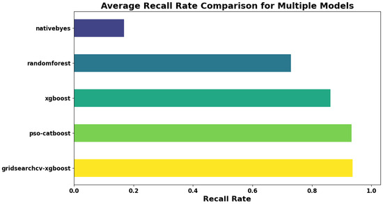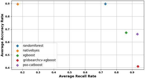 Given that the objective of this study was to identify as many open ports as possible, while minimizing the number of data packets sent, the goal after comparing the classification outcomes of multiple models was to detect over 90% of open ports. To more intuitively demonstrate the average performance of each model in terms of accuracy and recall, the average accuracy and recall rates of each model are compared in Figure 4 and Figure 5, respectively.