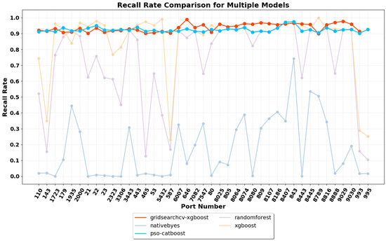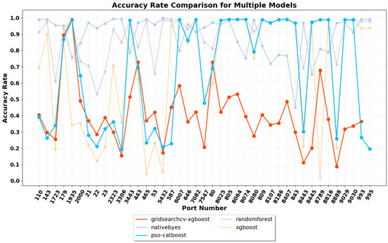Figure 6 reveals the recall performance of the different models across various ports and their comparisons. Particularly noteworthy is that the PSO-CatBoost and GridSearchCV-XGBoost models exhibited excellent and stable recall rates across all ports, indicating their ability to effectively identify positive samples. In contrast, the recall rates of the other models fluctuated significantly, failing to effectively identify positive samples on some ports and thus not meeting the performance standards we set. Figure 7 illustrates the accuracy performance and comparisons of the different models across various ports. Given our strict requirements for the identification rate of positive samples, we focus on models with recall rates exceeding 90%, namely PSO-CatBoost and GridSearchCV-XGBoost. Although the GridSearchCV-XGBoost model showed similar performance to the PSO-CatBoost model on some low-positioned ports, the PSO-CatBoost model exhibited a significant lead in accuracy on certain high-positioned ports. This suggests that the PSO-CatBoost model can make better judgments on the openness of uncommon ports under conditions of fewer positive samples.