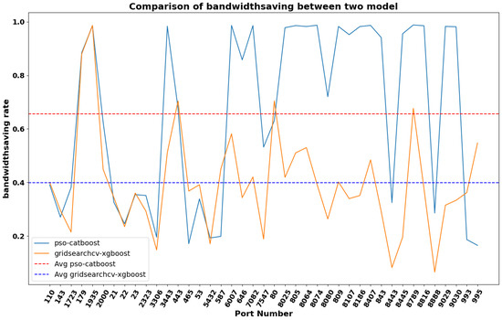 By calculating the bandwidth saving rate for models with recall rates greater than 90%, we found that the situation with bandwidth saving was somewhat akin to the accuracy rates. Figure 8 shows a comparison of the bandwidth savings rates and average bandwidth savings rates across various ports for the PSO-CatBoost and GridSearchCV-XGBoost models. The GridSearchCV-XGBoost model still performed well on lower-numbered ports, but showed mediocre performance on some higher-numbered ports. In contrast, PSO-CatBoost demonstrated a higher bandwidth savings rate on several higher-numbered ports, indicating its ability to more accurately predict open ports and thereby reduce unnecessary network traffic. Notably, the average bandwidth savings rate of PSO-CatBoost reached 65%, higher than the 40% achieved by GridSearchCV-XGBoost. This significant difference underscores the potential of our method in reducing the network load and improving scanning efficiency.