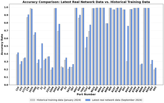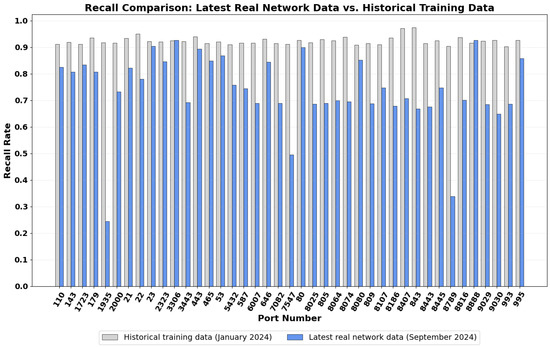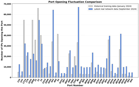 After preprocessing the data, we analyzed 1,188,000 IP records and found that only 24% of the IP addresses had at least one port open among the 41 predefined ports, while 76% of the IP addresses had no ports open. This result revealed a significant dynamism and unevenness in port opening status within the network, showing clear differences from the port opening patterns displayed in our previously used historical training data. Notably, during this nine-month period, the network conditions may have undergone significant changes, including but not limited to network configuration updates, deployment of new services, adjustments in security policies, and potential evolutions in network attacks and defense measures. These changes had a profound impact on the network environment, further exacerbating the volatility between real-world data and historical training data. To visually illustrate this port status volatility, we plotted the distribution of open port data between historical training data and real-time real-world data for different ports in Figure 10. Despite the significant changes in network conditions over this time span, our model’s accuracy improved slightly from 66.16% to 69.98%. This result indicates that the model demonstrated good stability in identifying port states. However, the recall rate decreased from 93.29% to 73.99%, revealing the challenges the model faced in detecting real-time open ports. This drop in recall rate may have been related to the dynamism of the real-world data and the model’s insufficient adaptability to emerging patterns not seen during training.