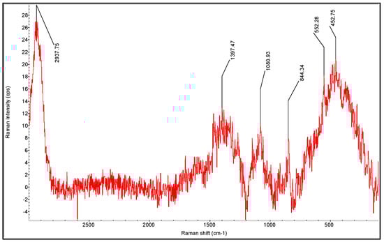 Polysaccharides were seen in the weak bands in the Raman spectrum between 1500 and 1800 cm−1. The spectral properties of different polysaccharides are distinguished by different gums. Of these polysaccharides, arabica gum is defined by having COC sugar ring vibrations at 1000 and 800 cm−1 [38]. When the Raman band of Arabica gum in Figure 6 was examined, COC vibrations were seen at 844.34 and 1080.93 cm−1.