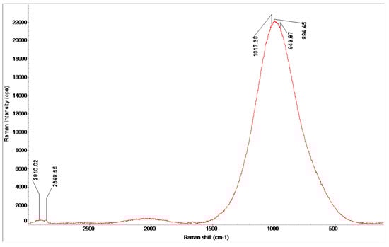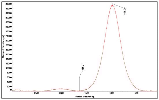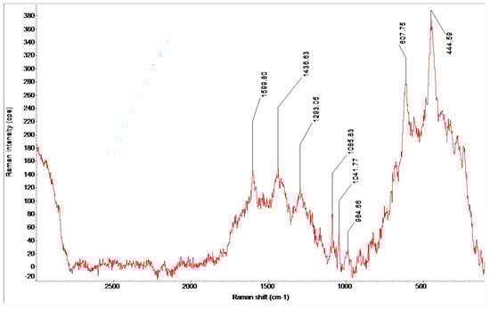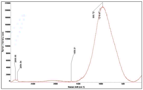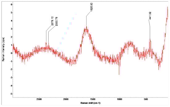 In Figure 7 egg yolk gave Raman band peaks at 441.32, 1625.90, 2330.78 and 2378.10 cm−1, respectively, while egg white in Figure 8 gave Raman band peaks at 1004.24, 1235.94, 1448.05, 1656.91 and 2941.02 cm−1, respectively. Cold-pressed linseed oil in Figure 9 showed strong peaks at 996.09 cm−1 and weak peaks at 1655.27 cm−1 in the Raman band, while cold-pressed walnut oil in Figure 10 showed strong peaks at 966.72 and 1015.67 cm−1 and weak peaks at 1656.91, 2854.54 and 2896.96 cm−1. In Figure 11, cold pressed poppy seed oil gave strong peaks at 943.87, 994.45 and 1017.30 cm−1 and weak peaks at 2846.65 and 2910.02 cm−1. This strong peak seen between 900 cm−1 and 1000 cm−1 in all three oils represents the CH=CH bond, while the peak at 1600 cm−1 represents the C=C double bond, which promotes the formation of solid films in the drying oils [39].