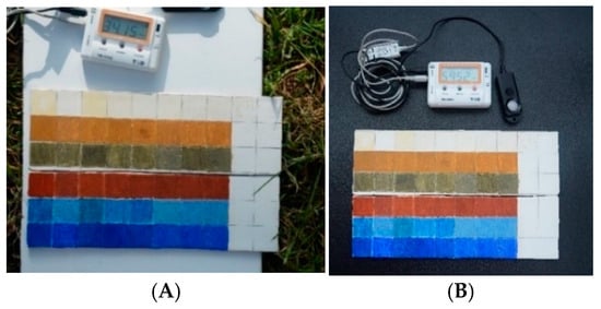 Natural Light: Since the images of the samples in natural light changed according to the angle of incidence of the sun rays, photographs were taken outdoors at sunrise, noon and sunset on a black and white background. According to the luxmeter data, the light intensity was measured at different intensities as 3415 K at sunrise, 1390 K-8185-7591 K at noon, and 5962-5317-4651-3821 K toward sunset. The photo shooting environment is given in Figure 14 and Figure 15.