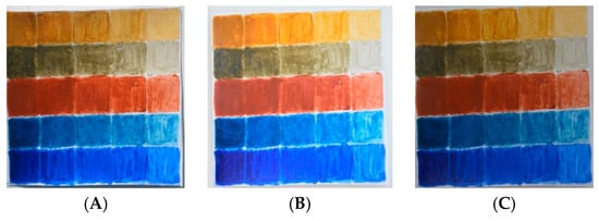 The light intensities of the photographs taken under the first condition were the following: 1029 K, 1239 K, 1325 K, 1895 K, 2214 K, 3031 K, 3546 K, 4024 K, 5015 K and 6512 K. The photographs taken under this condition are given in Table 5. Under the second condition, the LED was set to 5000 Kelvin in accordance with daylight, and the photographs were taken according to the different Kelvins in the color temperature options in the camera’s white balance setting. These photographs are given in Table 6. The camera was set to 2700 K for the warm white image, 4000 Kelvin for the warm white image and 5600 K for the cold white image. Since a blue tone was observed in the pigments in the photographs taken at 2700 K to obtain a warm white image, they were not used as a dataset.