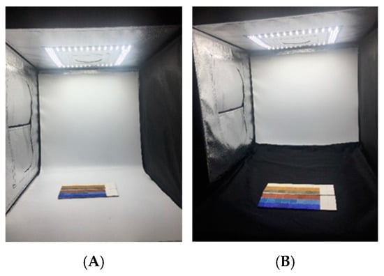 Artificial Light: Artificial light shots were taken under white and yellow light. LED was used as the white light source and an incandescent lamp was used as the yellow light source. LED light shots were taken in the Life of Photo product shooting tent. There were 120 LED lamps with a power of approximately 50 W on the upper part of the shooting tent. In this tent environment, samples were photographed under two different conditions. The first of these was adjusting the LED lights in the tent from the lowest to the highest level, and the second was keeping the LED lights constant at the highest light intensity and selecting different color temperatures on the camera. Under both conditions, photos were taken using black and white backgrounds. An example of the photo shoots is given in Figure 16.