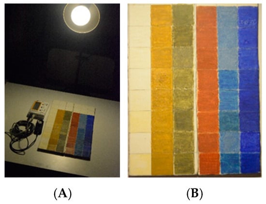 The second light source in artificial lighting, the incandescent lamp, was used to see the colors of the pigments in a dim yellow light environment. The light intensity of the incandescent lamp was measured as 2888 K in the lux meter. The photo shooting environment is shown in Figure 17.