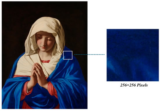 In the selection of the example, no attention was paid to the lighting conditions under which the photograph was taken, because within the scope of this study, artificial intelligence was trained with pigment photographs of different light sources and different light intensities. For this reason, it was not important whether the photograph of the work to be taken as an example was taken in daylight (morning, noon, evening) or under artificial light. The dataset in artificial intelligence was created by taking these light variables into account. The photographs of the artwork to be tested were cropped into a square shape in the Image Cropper Pro application and then converted to 256 × 256 pixels in the FastStone Photo Reziser application. This process is shown in Figure 23. In the test dataset created for each pigment type, images of artworks, as well as images of different paint companies and paints with different tonal contents, were used. The test of the pigments for the real class and predicted class was carried out in the VGG19 model, which had a 99% success rate. The data used in the test of the pigments and the VGG19 test results are given below.