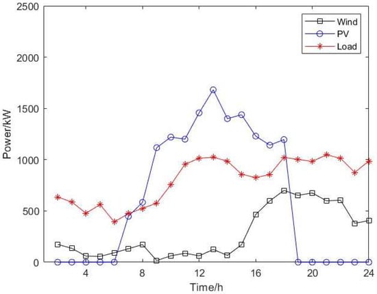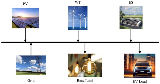 This paper constructs an ES allocation model for the WPEES based on the typical day generated through the MCS and BR method while considering the influence of EV charging behavior. The NE system is illustrated in Figure 1.