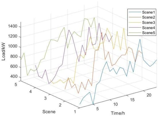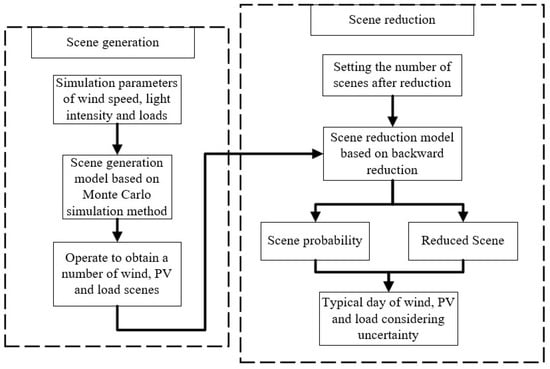 The MCS method generates a substantial amount of data, characterized by a high degree of similarity among the scenarios. To merge similar scenarios more efficiently, this paper employs BR to reduce scenarios to five and constructs typical day scenarios for wind, PV, and load, taking into account uncertainty based on the weights of these five scenarios. Figure 2 presents the flowchart of the scenario analysis model.