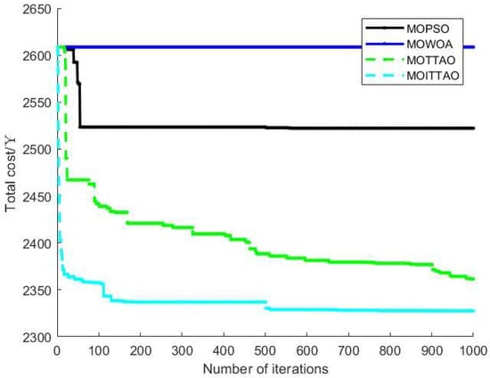 Figure 17 displays the Pareto solution set derived from utilizing MOITTAO to address energy storage configuration scenarios involving both disorderly and orderly charging of EVs. The compromise optimal solution is determined using the TOPSIS method and is detailed in Table 6.