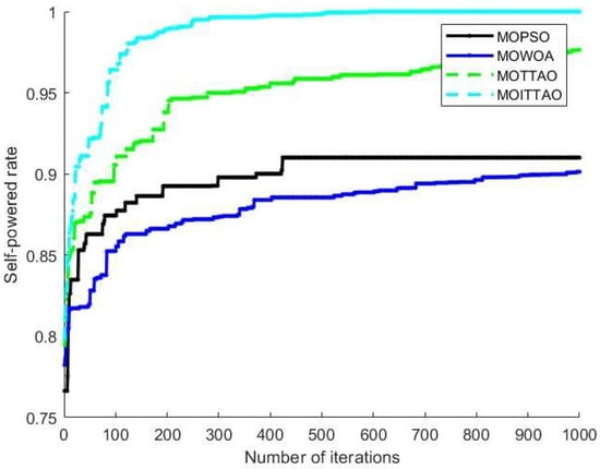 The self-supply rate refers to the proportion of load power met by wind power, photovoltaics, and storage battery discharges relative to the total load demand within the system. This metric reflects the reliability of the new energy power supply and is influenced by new energy output, load demand, and ES [36,37]. The maximum target for the self-supply rate of the system is expressed as follows: