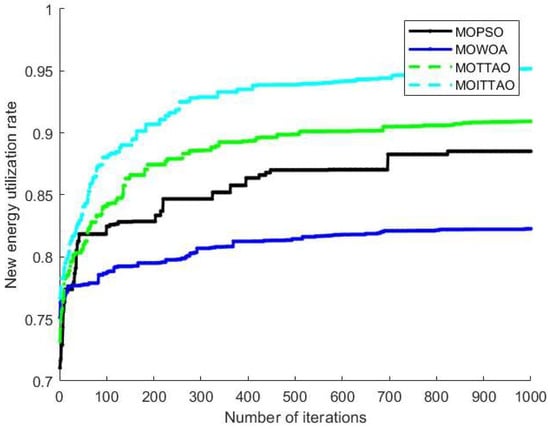 When system power supply exceeds demand, it can lead to power abandonment. The new energy utilization rate refers to the proportion of power (including ES charging) from new energy generation that occurs after power abandonment. A higher new energy utilization rate indicates less power abandonment [38]. The maximum target for the NE utilization rate is expressed as follows: