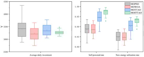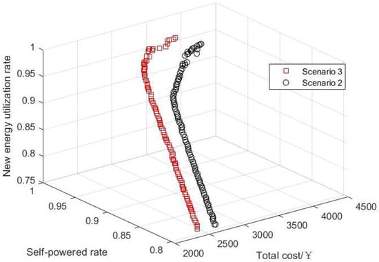 Figure 17 and Table 6 illustrate the Pareto solution, achieved by first optimizing the charging behavior of EVs and then configuring the ES system, which surpasses that of the pre-optimization state. Following the selection of the compromise optimal solution through the TOPSIS method, Scenarios 2 and 3 are set up with approximately equivalent energy storage capacities; however, the discrepancy in average daily costs is more significant, with the self-power supply rate rising by 2.25% and the new energy utilization rate increasing by 2.50%. The optimization of EV charging behavior effectively reduces the load standard deviation in the overall system load while simultaneously enhancing the operation of the ESS. In comparison to the scenario lacking an energy storage system, both the self-powered rate and the new energy utilization rate show significant improvements following the ES system configuration. In the cases of disorderly and orderly EV charging, the self-powered rates increase by 26.76% and 29.01%, respectively; meanwhile, the new energy utilization rates rise by 24.17% and 26.67%.