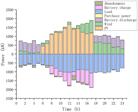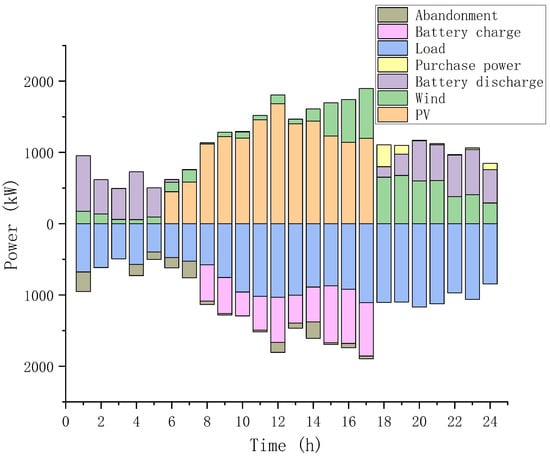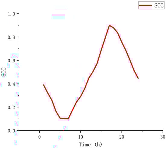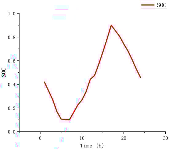 Figure 18 and Figure 19 illustrate the power balance diagrams for Scenarios 2 and 3. Figure 20 and Figure 21 depict the SOC of the two scenarios. Analysis reveals that from 1:00 to 5:00, the combined output of Wind-PV is insufficient to meet the load power demand. During this period, the ESS is continuously discharging. Between 8:00 and 17:00, the new energy generation exceeds the system’s load power, allowing the energy storage battery to charge during this time, leading to excess power generation that may be wasted. From 18:00 to 24:00, the new energy generation gradually decreases, the ESS discharges again to supply power, and when the ESS cannot fulfill the demand, power must be purchased from the grid.