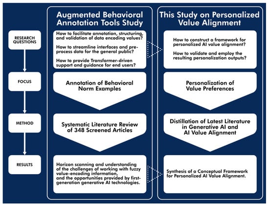 Inductive approaches were also derived from observations made during a scoping systematic literature review of tools which relate to Behavioral Annotation, Watson et al. [8]. Our approach involves building upon these findings by critically analyzing existing research to identify patterns, gaps, and new insights in AI alignment. This paper aims to build upon these findings by presenting an overview of a framework that can actualize them. A comparison of the two studies is displayed in Figure 1.