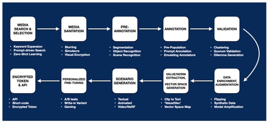 Our proposed framework consists of ten interconnected modules, each addressing a crucial aspect of AI value alignment. These modules span from initial media selection to the generation of personalized fine-tuning tokens. Before exploring each module, it is important to note that our experimental setup focuses on large language models (LLMs) as the primary AI software. The framework’s goal is to enable personalized interactions with these models while ensuring alignment with individual user values and preferences. Here, we describe each module in detail: