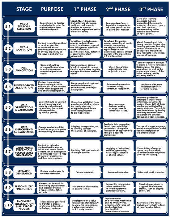 Despite the rapid advancement in machine learning technology, this pipeline is designed to be accessible via a wide number of devices. This framework outlines the general process of facilitating successive automated annotation processes. It is designed with modular and independent subparts, allowing individual components to be quickly retrofitted as new capabilities emerge. The framework also encompasses features that have been demonstrated individually or prototypically but are not yet widely deployed. Technological advancement is expected to enhance these subprocesses as techniques continue to evolve and improve. The modularity of the pipeline also allows for easy inclusion of unforeseen capabilities. Figure 2 outlines a general data flow for this pipeline. The bullets between each module reflect the presumed phases of future development explicated in Figure 3.
