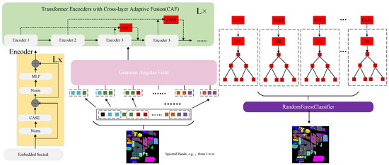 In response to the limitations of current deep learning methods, which predominantly handle two-dimensional data and struggle with issues such as dimensionality curse, spectral variability, and classification confusion in hyperspectral remote sensing images, this study introduces a novel algorithmic framework named RS-Net. This framework integrates Random Forest and the SpectralFormer network architecture for land cover classification, as depicted in Figure 1. The primary innovation of this paper lies in the effective translation of one-dimensional signal data into two-dimensional image features. To achieve this, we propose the use of the Gramian Angular Field (GASF) and Gramian Angular Difference Field (GADF) algorithms. These algorithms adeptly map the target information embedded within the one-dimensional signals, which are processed by the Transformer, onto a two-dimensional feature space. This approach significantly enhances the accuracy of feature extraction and recognition within the backend network algorithms. To address the challenge of capturing feature relationships across different scales, we introduce the SpectralFormer network equipped with the CASE module. This module is designed to effectively learn the inter-channel dependencies, thereby enhancing the prominence of important features while suppressing less relevant ones. This targeted feature refinement addresses the semantic gap issue commonly encountered in hyperspectral image analysis. The final component of the RS-Net algorithm is the Random Forest classifier, which is employed to aggregate the prediction results from the SpectralFormer network. By consolidating these results through a voting mechanism, the algorithm achieves pixel-level multispectral image classification. This strategy not only realizes a more precise classification but also effectively mitigates the semantic gap and dimensionality curse problems inherent in hyperspectral remote sensing imagery. In summary, this paper systematically develops and integrates a series of innovative techniques to overcome the challenges associated with hyperspectral image classification. The proposed RS-Net algorithm leverages the strengths of both SpectralFormer for feature representation and Random Forest for robust classification, resulting in a comprehensive and effective solution for land cover classification in hyperspectral remote sensing images.