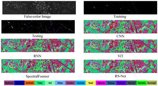 The primary goal of our experiments is to assess whether the proposed RS-Net can be deemed a state-of-the-art tool for hyperspectral image classification tasks. Therefore, we have chosen four popular deep learning-based solutions for comparison: CNN, RNN, Transformer, and SpectralFormer’s model. The details of our competitors are as follows. (1) A CNN consists of a convolutional layer, a corresponding 1-D or 2-D BN layer, ReLU composition, a Fully Connected (FC) layer, a Maximum Pooling layer, and an output layer. (2) In an RNN, two layers of loops and cascaded gated loop units are included. (3) The Transformer model is based on the Vision Transformer (ViT) architecture, consisting of 5 encoder blocks with a dimension of 64 for each grouped spectral embedding. Each encoder block comprises 4 self-attentive layers, 8 hidden layers of Multilayer Perceptrons (MLPs), and a dropout layer that deactivates 10% of the neurons. (4) SpectralFormer is based on the ViT model, enhanced with grouped spectral embeddings to improve local spectral details and additional FC layers to encode spatial information of flat image blocks. The dimension of each grouped spectral embedding is 64, and the grouped spectral nesting is set to 2.