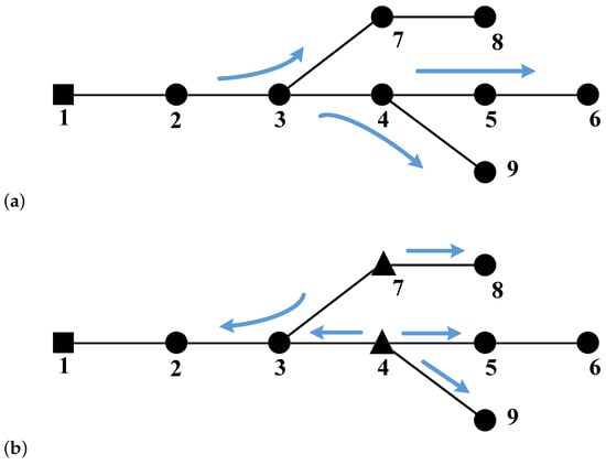 In addition, the high proportion of PV access will also change the energy consumption structure of the traditional DN. The energy consumption structure of the traditional DN is to supply power to the DN through the superior grid, so as to meet the electricity demand of DN. When the PV is large enough, the electricity load of the DN will be entirely borne by the PV, and the excess PV power generation will flow to the superior grid, causing the occurrence of the reverse transmission phenomenon (RTP) [2,3]. Figure 1 shows the energy flow of the traditional DN and the DN with a high proportion of PV access. Squares represent balance buses, circles are load buses, triangles are PV grid-connected buses, and arrows indicate the direction of energy flow. It can be seen that the energy of the traditional DN flows from the balancing bus to the remaining load buses. However, the energy flow direction of the DN with a high proportion of PV access is from the PV buses to the rest of the load buses and the balance bus, so its voltage will be higher than the reference voltage at the balance bus [4], which makes the DN have the risk of overvoltage [5,6]. Therefore, although PV has been developed very rapidly due to its environmental protection and renewability, its uncertainty and impact on the security of the DN limit its HC [7,8]. The above analysis shows the adverse factors that affect the PVHC. But, with the development and construction of the intelligent DN, various active management (AM) strategies can effectively improve PVHC, such as network reconfiguration and static Var compensator (SVC) control [9].
