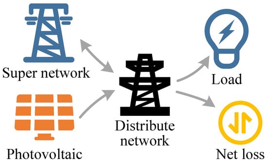 The DN with PV access receives or transmits power to the higher power grid through the transmission line; the main power generation source is PV, and the power consumption sources are load and network loss, as shown in Figure 2. Among these, PV and load have uncertainty [29,30]. Robust optimization ensures that, even in the worst scenario, the optimization solution is feasible [31]. Refs. [32,33] established an adaptive robust stochastic optimization model to address the renewable power uncertainty modeled as a scenario-based ambiguity set. We describe the uncertainty of PV and load by this method. Furthermore, considering the absolute nature of PVHC, any solution within the uncertainty set should yield a value greater than the resulting PVHC. Therefore, the key to solving this uncertainty problem lies in identifying the worst-case scenario for PVHC calculation. As in (1)–(3), we describe the source–load uncertainty through box uncertainty sets.