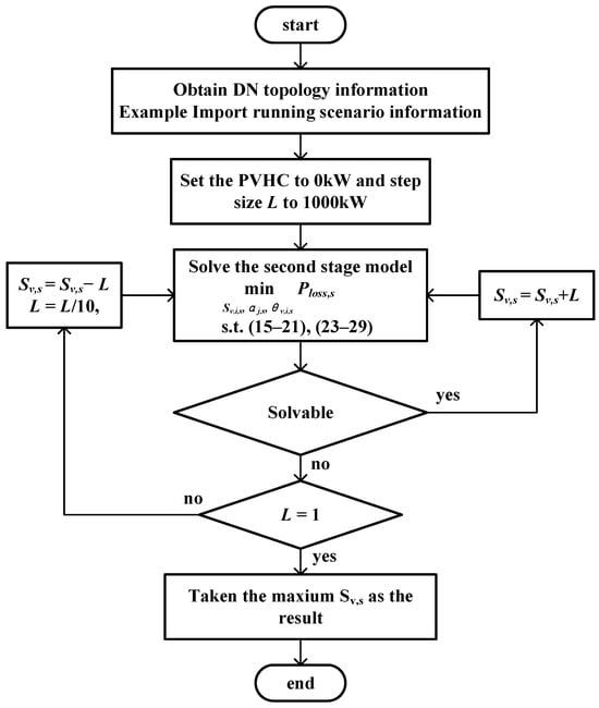 The model is divided into two stages. The first stage is the outer max problem, which maximizes the PVHC. The second stage is the inner layer min problem, which determines the PV configuration plan, the switch status of each branch, and the power angle of the inverter to minimize the network loss. To solve this problem, the method of “variable step size traversal + solver” is adopted, as in Figure 3.