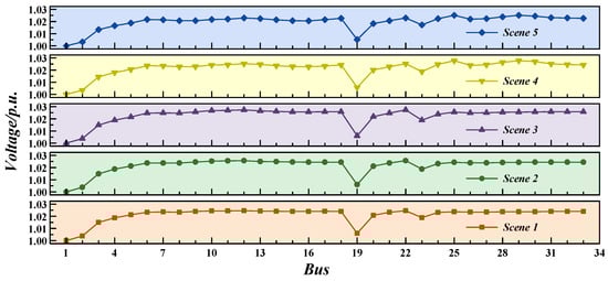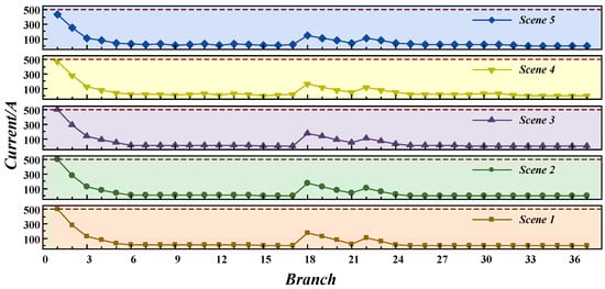 The bus voltages and branch currents of each scenario are shown in Figure 4 and Figure 5. From the figures, it can be found that the voltage is minimum at the balancing bus and gradually increases towards the PV configuration bus, and that the current is maximum at the balancing bus and gradually decreases towards the PV configuration bus. This phenomenon reflects the situation of DN with maximum access to PV. In this case, the RTP that causes the power flow back occurs, making the voltage and current characteristics opposite to the original.