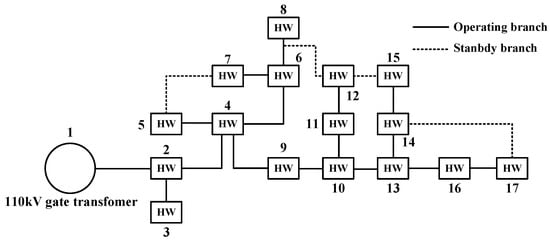 During the planning phase, the DN adopts a closed-loop design, whereas, during actual operation, it needs to maintain an open-loop configuration. Consequently, backup lines are available, making network reconfiguration feasible. Furthermore, since the original DN topology design did not take into account the scenario of PV limit access, it is of great significance to explore the optimal topology for PVHC through network reconfiguration. The topology of the reconfigured DN must meet the radiation and connectivity constraints [9,38].