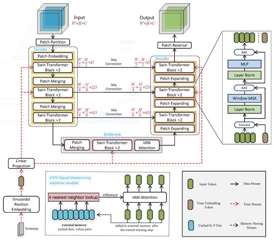 Overall, our novel approach is built upon three primary components: (1) a Swin-Transformer backbone that effectively captures both local and global features, (2) a hierarchical time-stream embedding mechanism that improves the integration of temporal information during the denoising process, and (3) a kNN-based memorizing attention module that enhances the model’s training speed and interpretability.