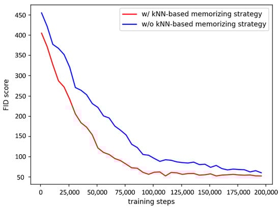 - Convergence speed: We evaluated the impact of incorporating the kNN-based memorizing attention module on the convergence speed by calculating the FID score at 1000-step training intervals on the CRC-VAL-HE-7K dataset. Illustrated in Figure 4, the FID score declines more rapidly in the presence of kNN-based memorizing strategy. Our findings indicate that the strategy not only expedites model convergence, but also yields a superior FID score.