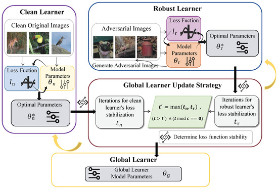 The specific update strategy for the global learner is shown in Equation (8). When the learning rounds of the basic learners , the clean learner and the robust learner learn independently without interference. When the learning round , the parameters of the two basic learners are mixed in proportion to to update the learning parameters for the current round. The previous round’s learning experience is iteratively updated with a learning rate , as follows: . The value of determines the importance of the basic learners to the global learner. Adjusting can control the model’s emphasis on handling clean samples versus adversarial samples. Throughout the process of updating the global learner, the basic learners pass parameters every c rounds. The function is a boolean function that returns 1 if and only if and , otherwise it returns 0. In simple terms, after round , the global learner’s parameters are updated every c rounds. When , the clean learner and the robust learner continue their independent training.
