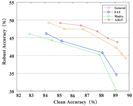 To comprehensively explore the trade-off between clean accuracy and robust accuracy of different defense methods, this study further analyzes the performance of clean accuracy under various levels of robust accuracy during training. As shown in Figure 2, we conducted a detailed comparison of the A3GT method with existing methods such as Generalist, FAT, and Madry. Overall, the experimental results indicate that most methods exhibit a decline in clean accuracy as robust accuracy increases. Specifically, the FAT and Madry methods show a significant drop in clean accuracy when the robust accuracy approaches 40%. In contrast, the Generalist method achieves a more balanced result between robust accuracy and clean accuracy. Additionally, the A3GT method achieves a better balance between robust accuracy and clean accuracy compared to the Generalist method. The experiments reveal that the A3GT method can maintain robustness while minimizing the decline in clean accuracy, resulting in a more resilient model against adversarial attacks.