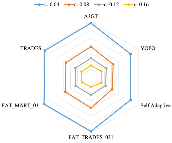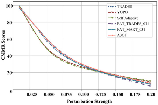 As shown in Figure 3, the CMMR score of the A3GT method generally surpasses that of the other five defense methods. Specifically, when , the A3GT method is slightly inferior to TRADES and Self Adaptive, but the difference is minimal. As the adversarial perturbation strength increases, when , A3GT ranks second only to the FAT_TRADES_032 method, and thereafter, its CMMR score exceeds that of any other defense method. When , the A3GT method is second only to YOPO and Self Adaptive. From these results, it is evident that while the A3GT method does not consistently outperform all other defense methods across the entire range of perturbation strengths, it demonstrates stable and superior performance overall. Additionally, radar charts depicting the CMMR scores of A3GT and the other five defense methods at perturbation strengths of , , , and are presented in Figure 4. As shown, the A3GT consistently leads in CMMR scores across all four conditions compared to the other five defense methods.